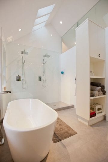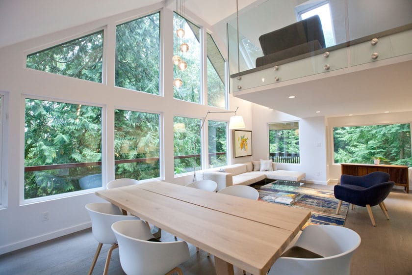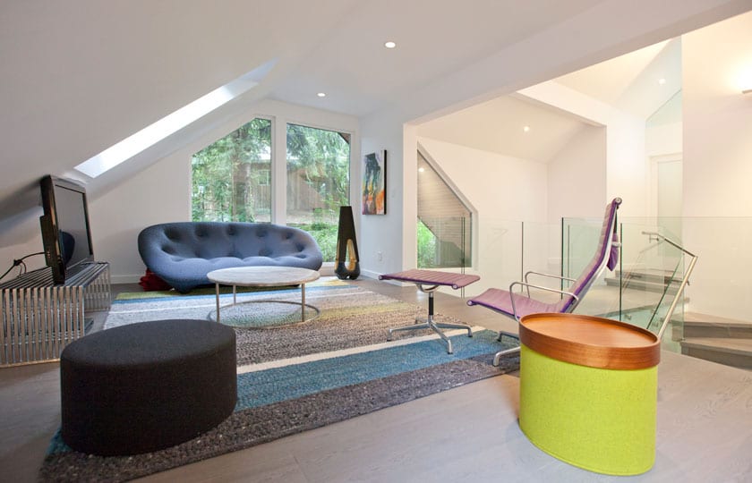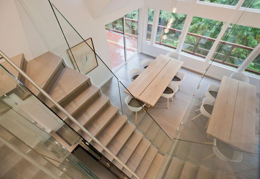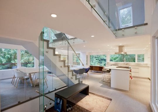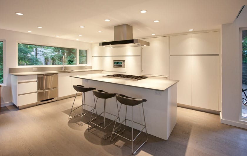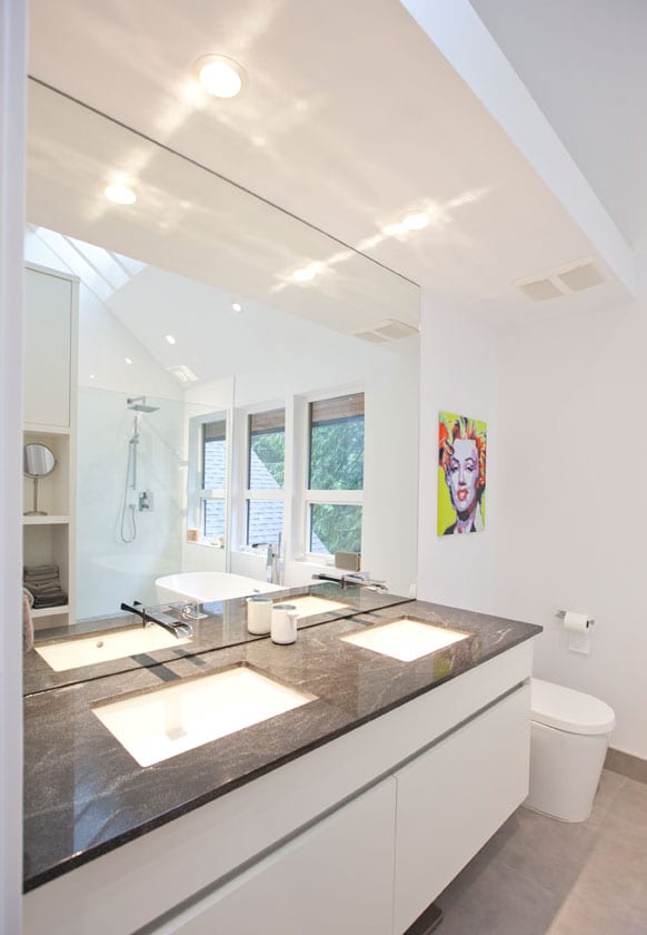 This renovation to a North Shore home began with an addition of a second floor and the redesign of the main floor. The master bedroom, walk in closet and bath occupy the newly added floor space, but the redesign of the main floor incorporated extensive changes to the structure of the home, including a suspended steel beam, allowing for the removal of that floor’s supporting walls and opening up the area completely.